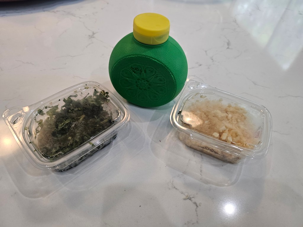 You don’t have to use fresh cilantro — you can add dried spice. Same with the garlic, i guess. And you can use fresh squeezed lime juice if you’re feeling bougie…