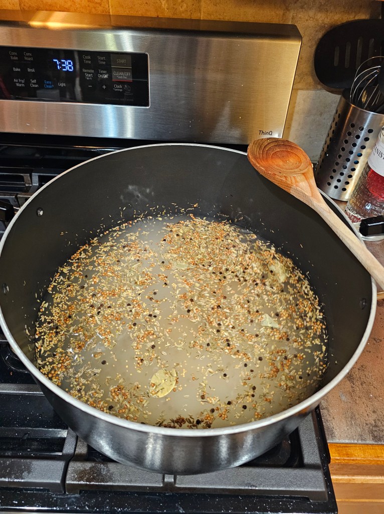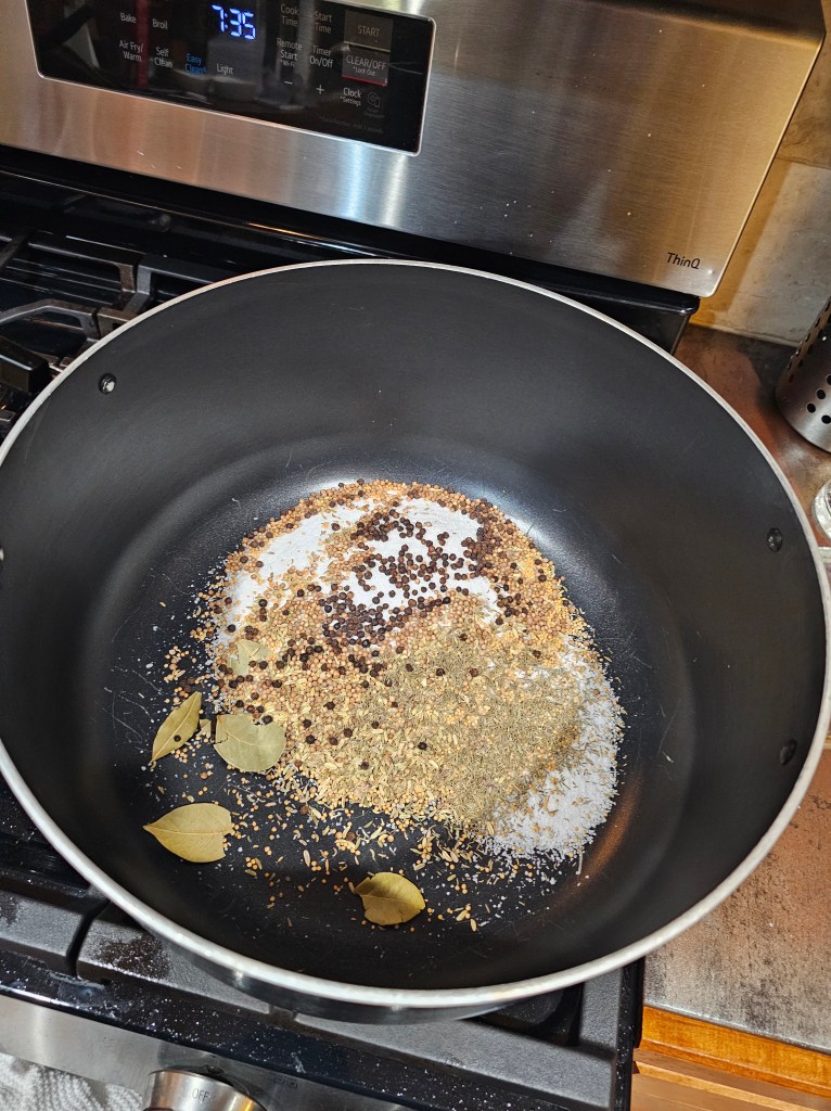 Usually, I use bay leaves, fennel seeds, coriander seeds, mustard seeds, mixed pepper pods, thyme leaves, crushed garlic cloves, and….