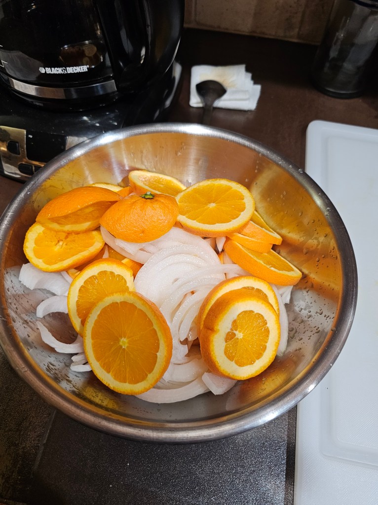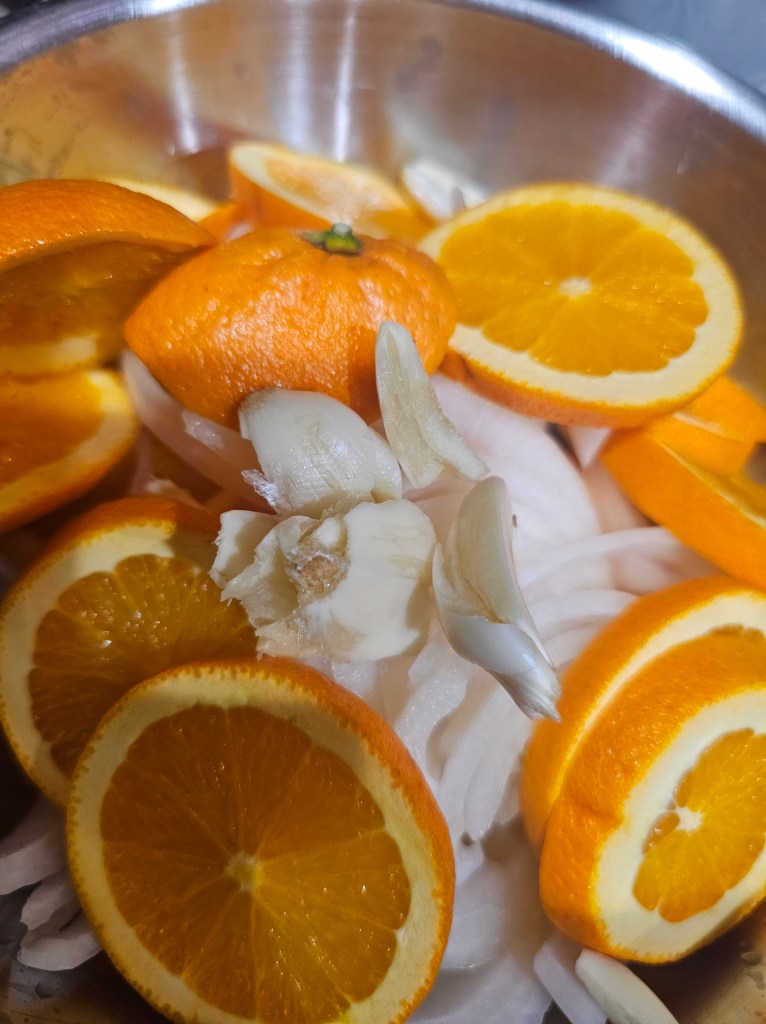 Slice an onion and 3 or 4 oranges — fresh slices fennel if you have any — apples too. Crush some garlic with a knife. Whatever aromatics you like.
