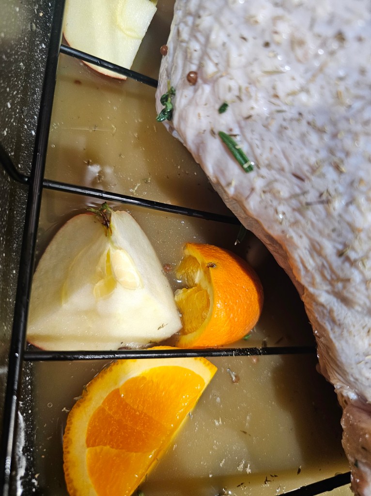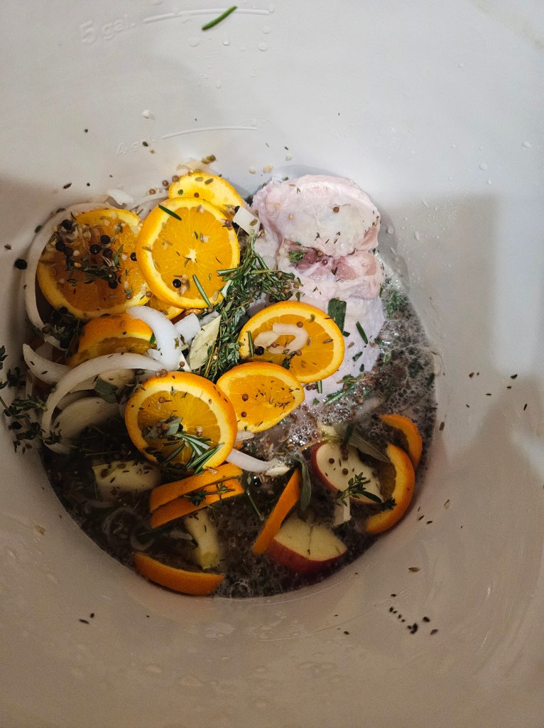 Put that turkey in a vessel. Pour the COOLED liquid over it, and add the sliced onion, oranges, apples, and garlic. Add fresh herbs — rosemary, sage, and thyme — the poultry mix of herbs…and more garlic. Then, add a bottle of dry Riesling — doesn’t matter the brand — just dry Riesling. AND top it all off with Apple Juice until the bird is covered.