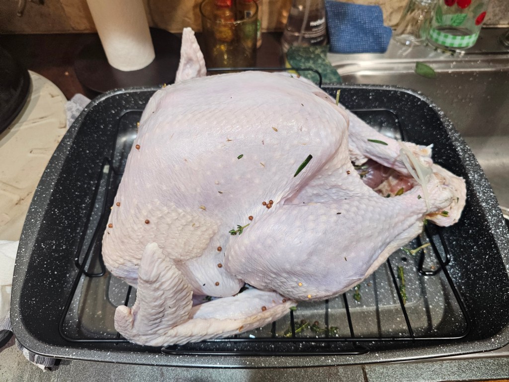 THEN — let is brine, let it brine, don’t look/touch any more – Let it brine, OVERNIGHT! Turn away and leave it alone! I don’t care what others say — let the bird alone — the wet cold is best for it anyway! (If you didn’t sing that, I’m dissapointed….)
