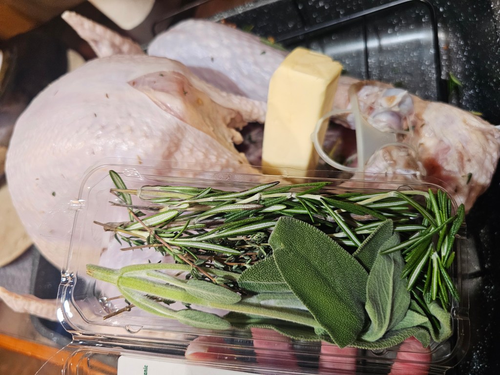 Squeeze a lemon over the skin. Squeeze an orange over the skin. Rub a stick of butter over the skin. Sprinkle with thyme and rosemary. Don’t be shy. Rub that breast!