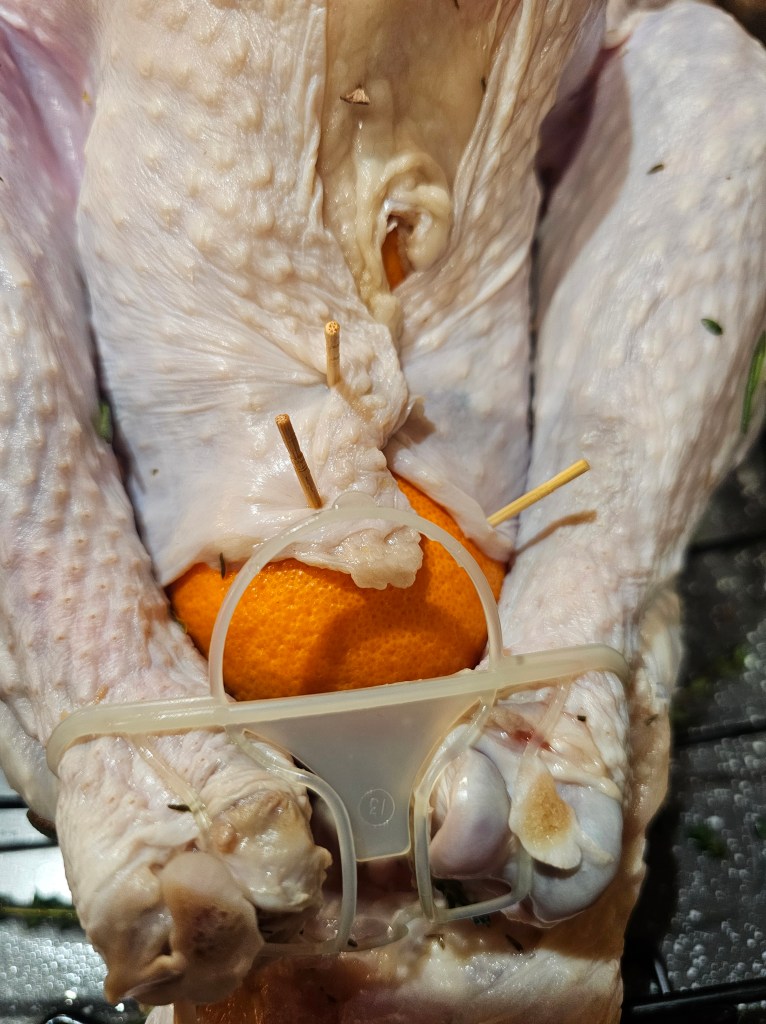 Stuff a half orange in the end to hold everything in and keep it in place with some toothpicks. Now, let’s dress the breast.