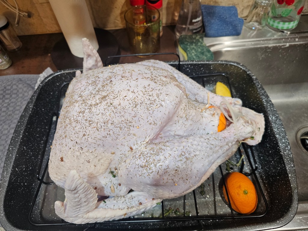 Treat the back like the front — squeeze lemon, and an orange, rub with butter, and sprinkle with thyme and rosemary sprigs.