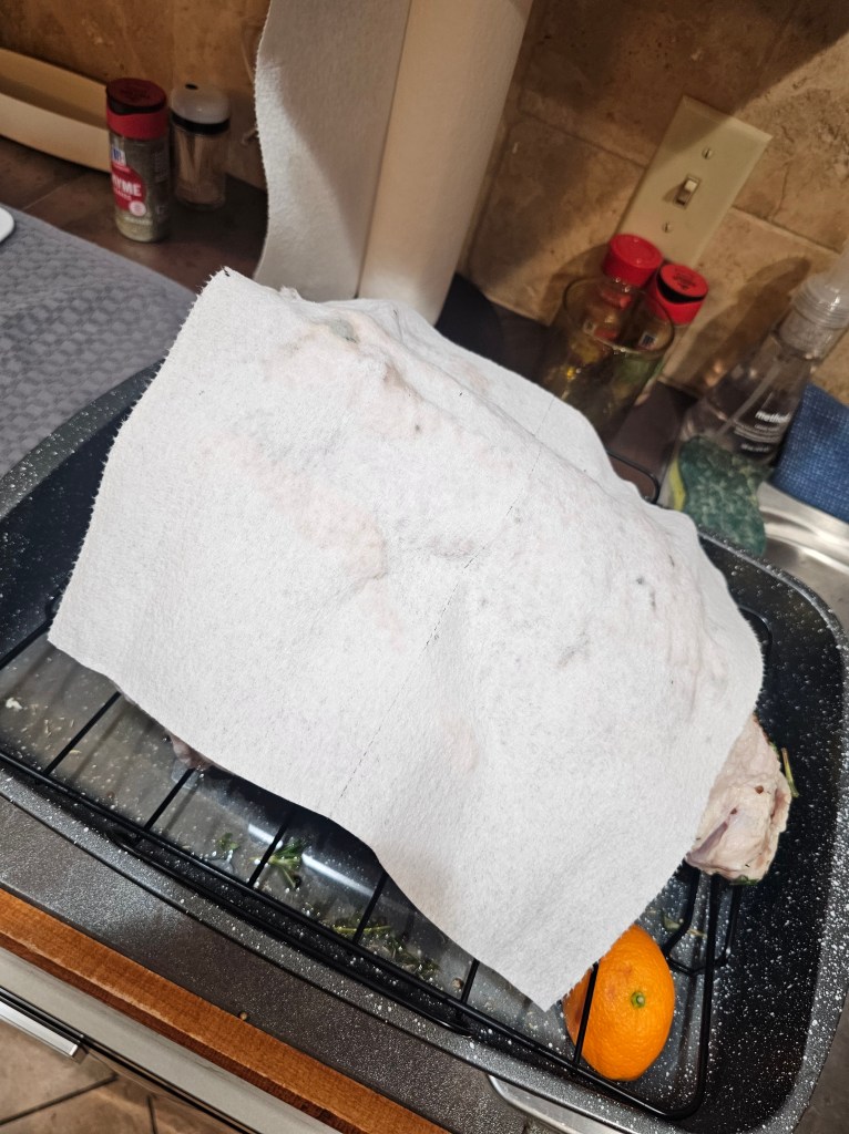 Take the bird out of the brine — and pat it dry. Get all the water out of its nooks and crannies. Inside, outside, the pits, and cavities. Pat it dry and let it rest. It roasts better closer to room temperature so let it come up from the icy bath it spent the night in.