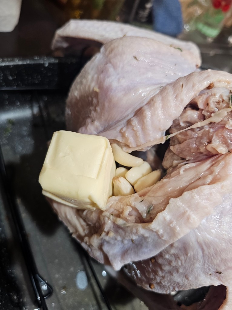 Shove it all inside. Bend em if you have to, but put the butter, herbs, and a handful of garlic cloves inside that bird with quartered oranges, and apples too.