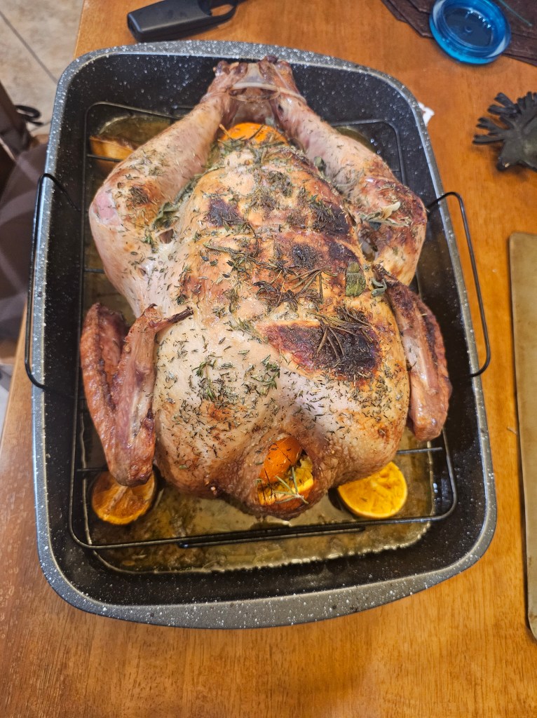 After 2.5 hours, your dad flips it for me and I put more herbs, acid (fresh squeezed orange and lemon), and added butter sticks — I’ve never done this before, not sure why I did this time?!?! Blame the ADHD???