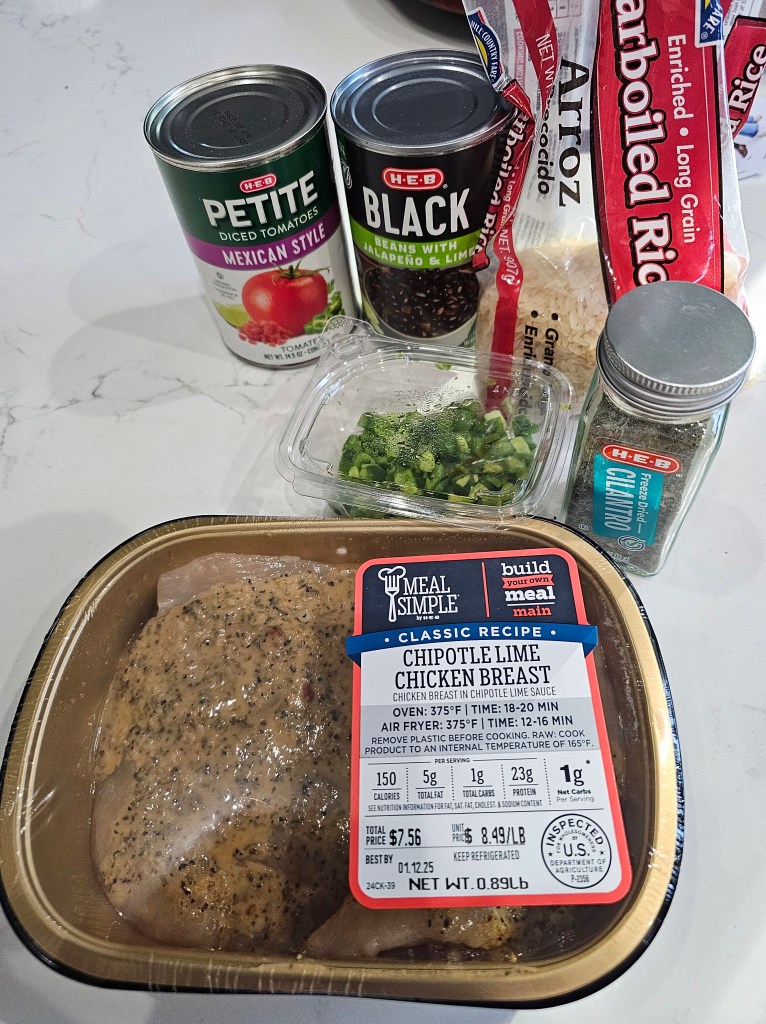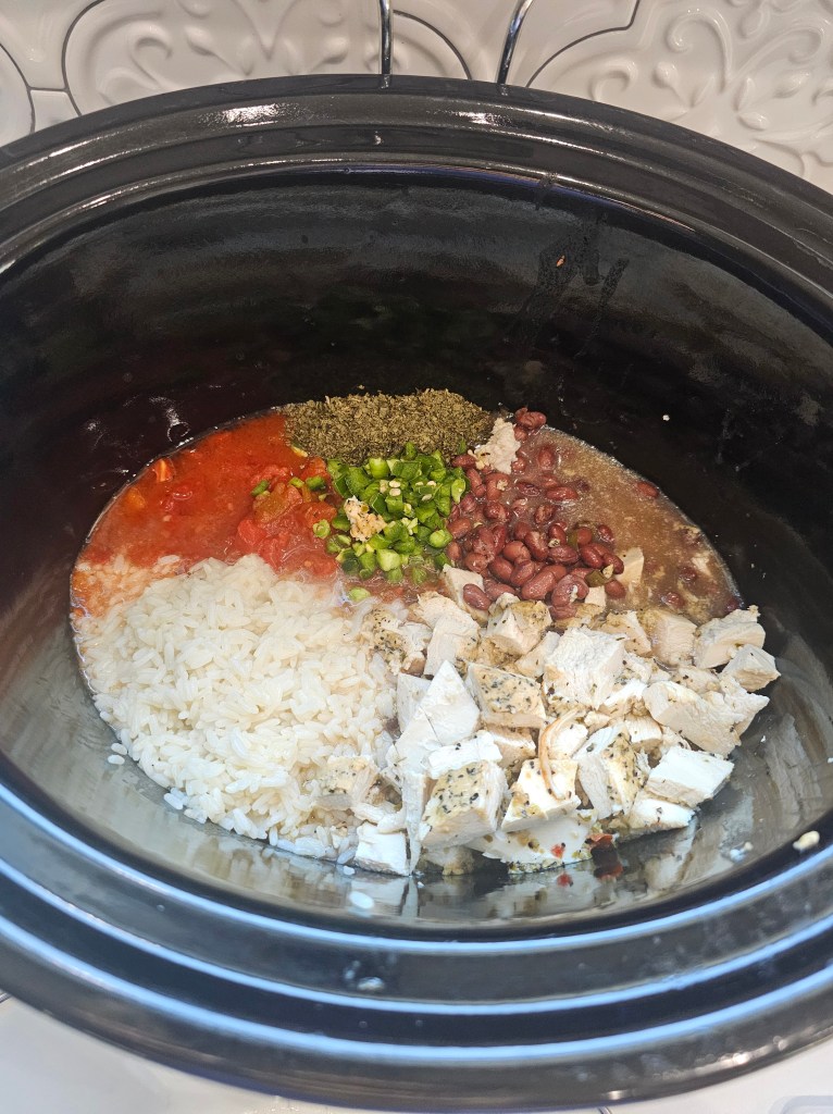 Anyway, start with chicken, beans, tomatoes, jalapenos, rice, and cilantro. I’m using parboiled rice because the bag was open, but normally we use spanish or mexican rice or white rice, but whatever.