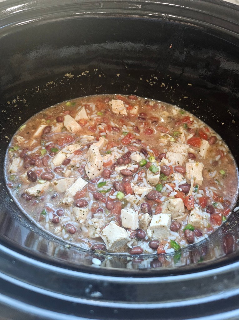 Cook the chicken in the oven. Chop it up — not neatly, just bite sized chunks! Cook the rice on the stove. Dump everything in a crock pot on high if you’re eating soon, on low if you’re eating later.